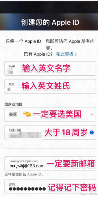 https://appleid.apple.com/account。按照页面提示,填写邮箱、设置密码(请遵守上述密码安全建议),并输入姓名、生日(确保大于18岁)等基本信息。
