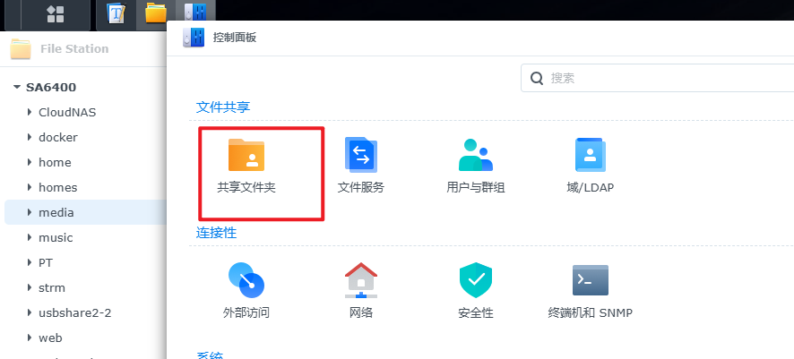 打开群晖的桌面主菜单,找到并点击 “控制面板”。找到共享文件夹设置