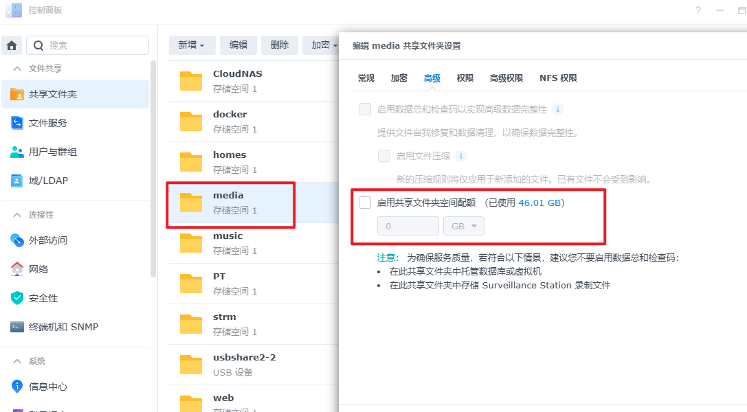 📊给共享文件夹(例如 PT 或 media)设置空间上限: