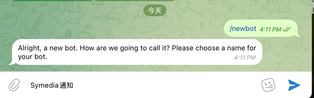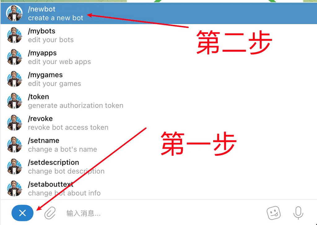2、点击左下角菜单栏,点击最顶部 /newbot
