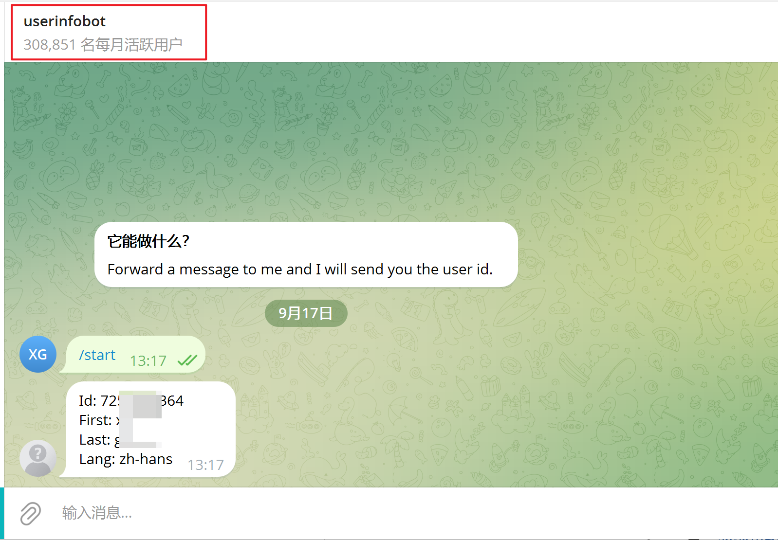 向该机器人发送任何消息,它会回复你包含你的用户 ID 的信息。