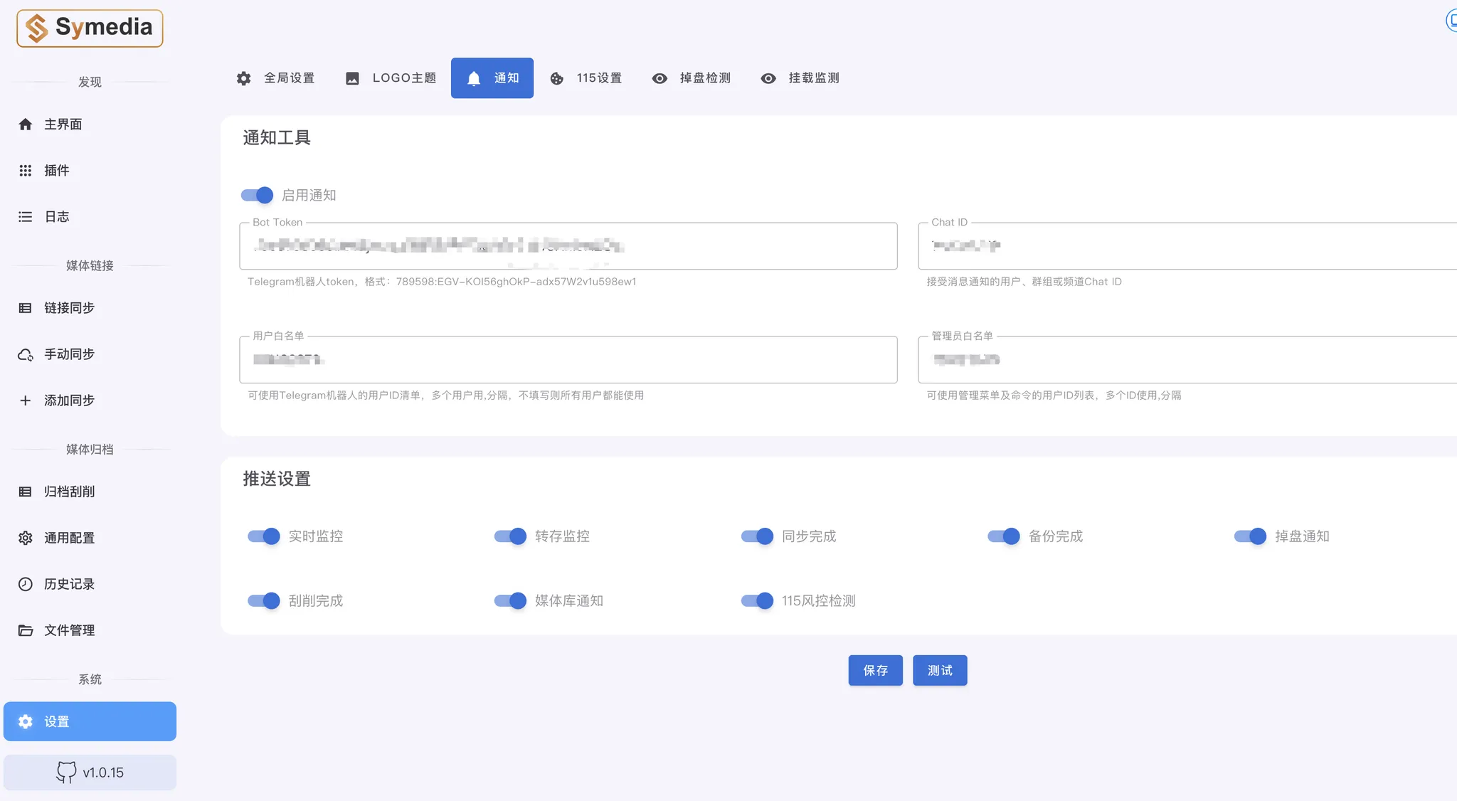左侧第一行,填入刚刚从 @botfather 获取的API,其他三个文本框,均输入@getidsbot 获取的ID,将下面八个开关按需打开,再点击保存和测试,看看机器人是否给你发送通知,如下图